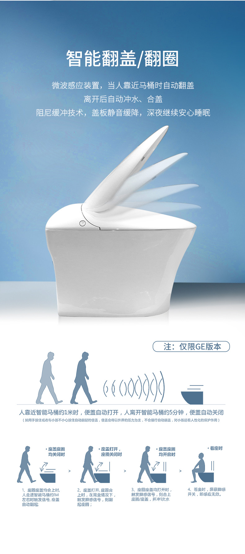 產(chǎn)品功能:1、微波感應(yīng)、自動翻蓋/翻圈、